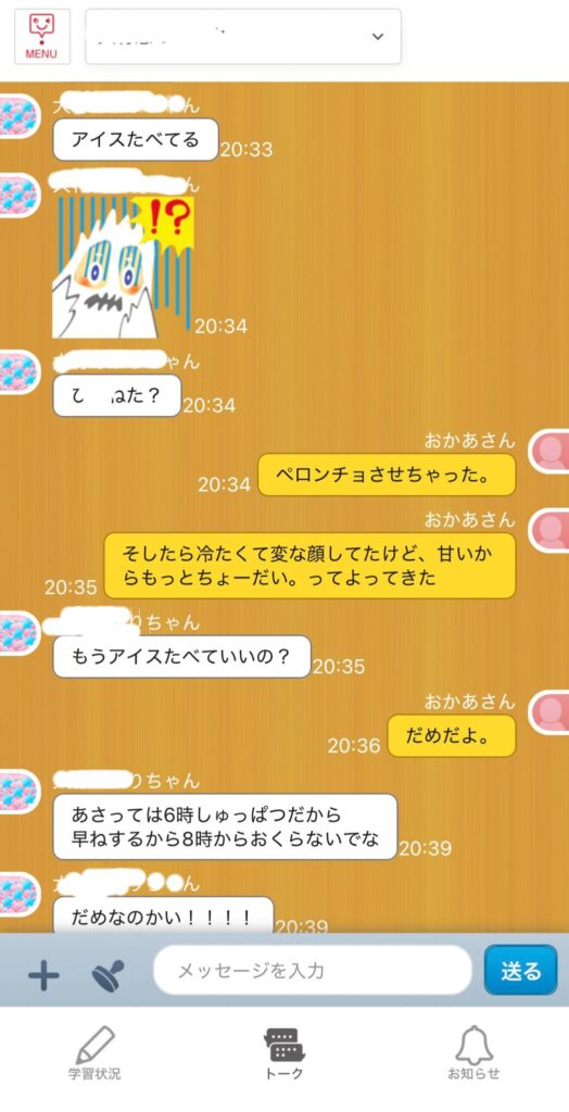 スマホはまだ持たせてないですが、「ワークをしたよ。」という内容だけじゃなく、学校であったこととかも自分で文章を入力でき、スタンプや写真も送信できるので、まるでLINEをしているような感覚も持てるようです✨